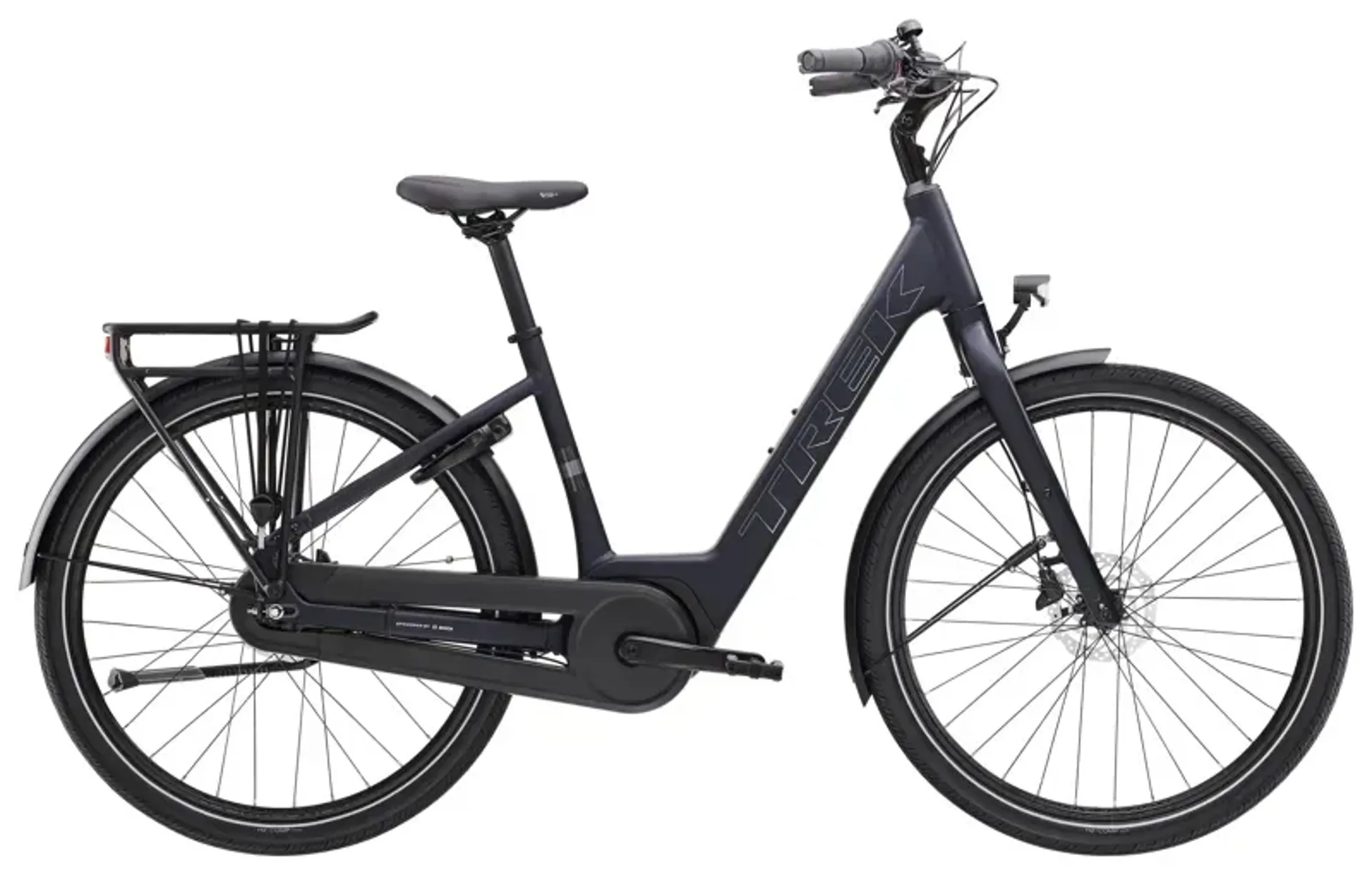 2026 Trek District+ 1 Lowstep Hybrid E-Bike in Matte Deep Dark Blue